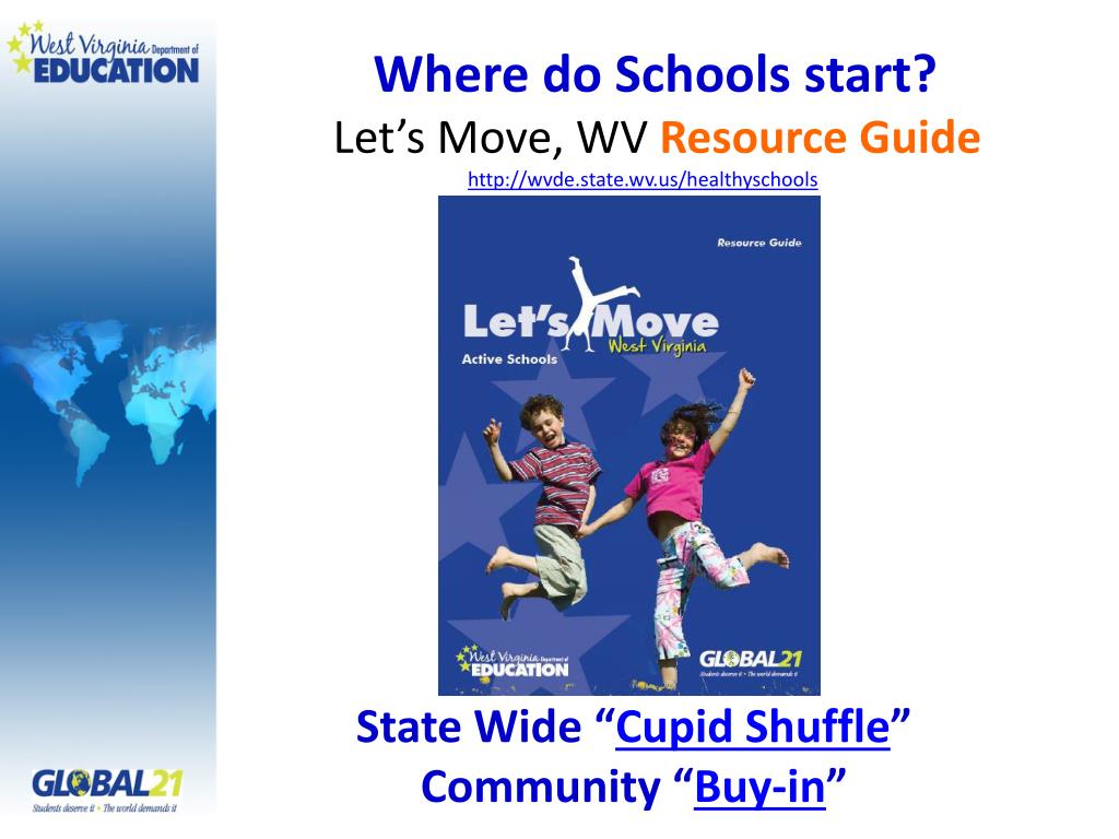 Where do Schools start? • Let’s Move, WV Resource Guide • http://wvde.state.wv.us/healthyschools State Wide “Cupid Shuffle” Community “Buy-in”