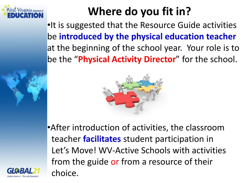 Where do you fit in? • It is suggested that the Resource Guide activities be introduced by the physical education teacher at the beginning of the school year. Your role is to be the “Physical Activity Director” for the school. • After introduction of activities, the classroom • teacher facilitatesstudent participation in • Let’s Move! WV-Active Schools with activities • from the guide orfrom a resource of their • choice.