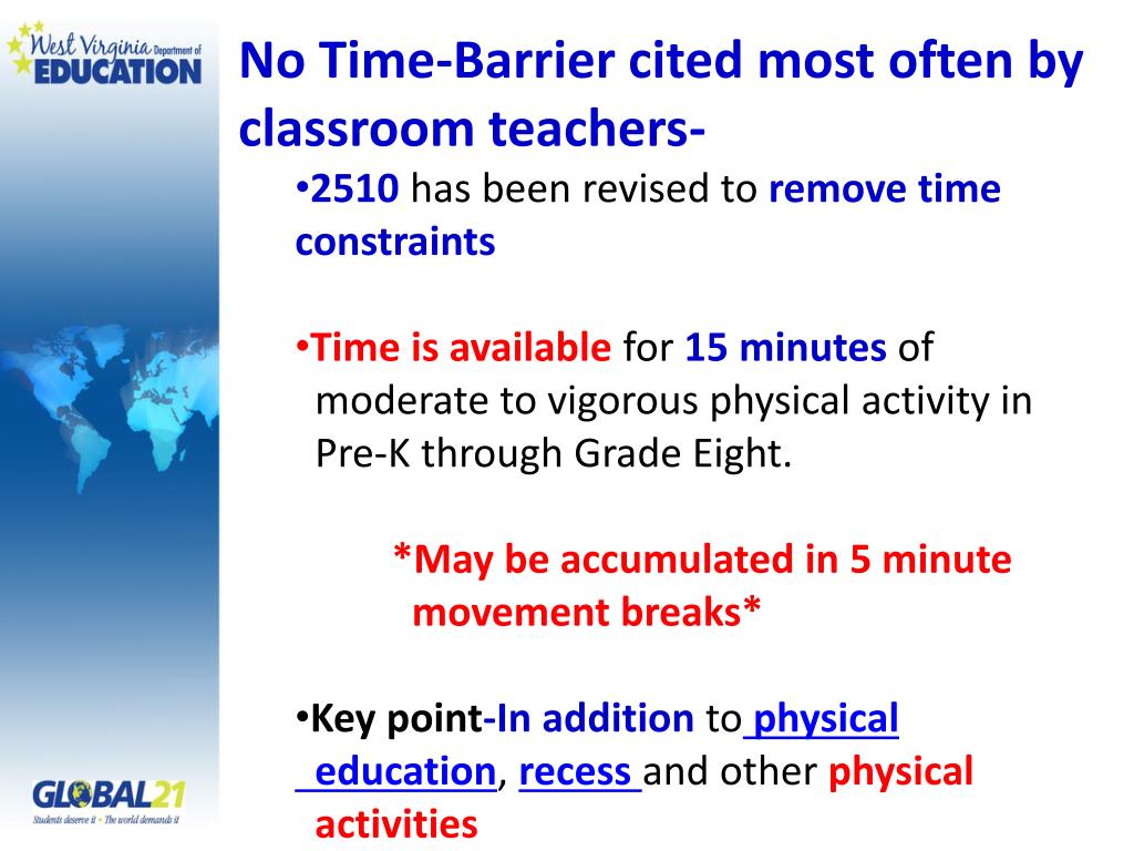 No Time-Barrier cited most often by classroom teachers- • 2510 has been revised to remove time constraints • Time is available for 15 minutes of • moderate to vigorous physical activity in • Pre-K through Grade Eight. • *May be accumulated in 5 minute • movement breaks* • Key point-In addition tophysical • education, recessand other physical • activities