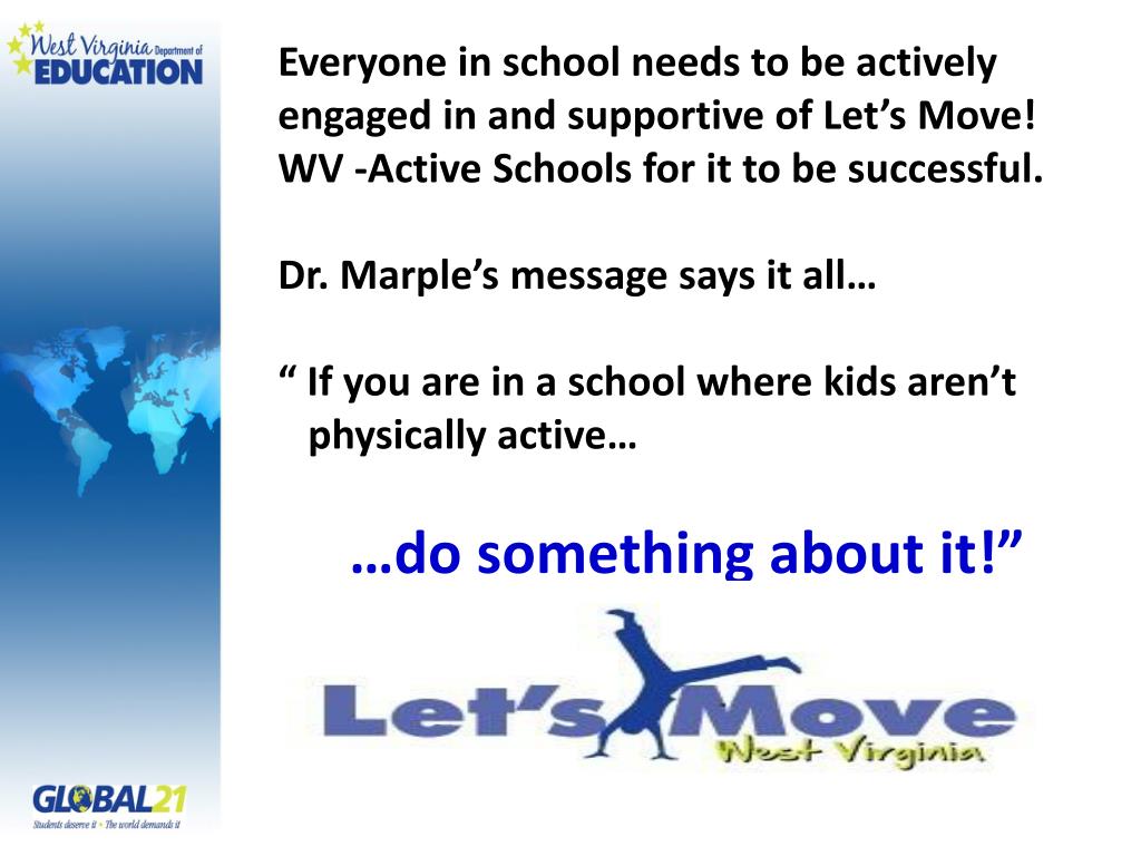 Everyone in school needs to be actively engaged in and supportive of Let’s Move! WV -Active Schools for it to be successful. Dr. Marple’s message says it all… “ If you are in a school where kids aren’t physically active… …do something about it!”