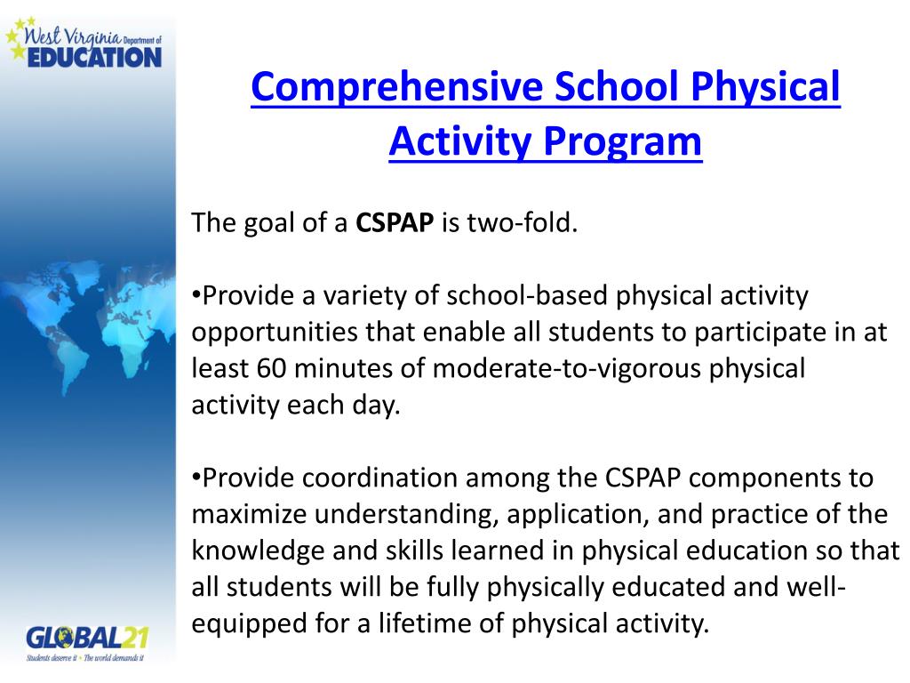 Comprehensive School Physical Activity Program • The goal of a CSPAP is two-fold. • Provide a variety of school-based physical activity opportunities that enable all students to participate in at least 60 minutes of moderate-to-vigorous physical activity each day. • Provide coordination among the CSPAP components to maximize understanding, application, and practice of the knowledge and skills learned in physical education so that all students will be fully physically educated and well-equipped for a lifetime of physical activity.