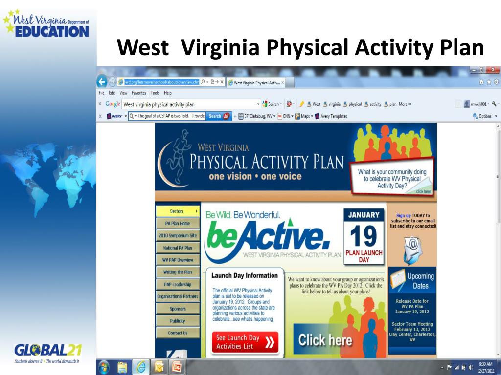 Professional Development • RESA Regional School Wellness Specialist • (RSWS) available for technical assistance • Office of Healthy Schools- • http://wvde.state.wv.us/healthyschools/ • Health and Physical Education • Leadership Academy http://wvde.state.wv.us/healthyschools/quicklinks.html • West Virginia Association for Health, Physical • Education, Recreation and Dance • (WVAHPERD) Fall State Conference • http://www.wvahperd.org/ • KidStrong-June 13-14, 2012