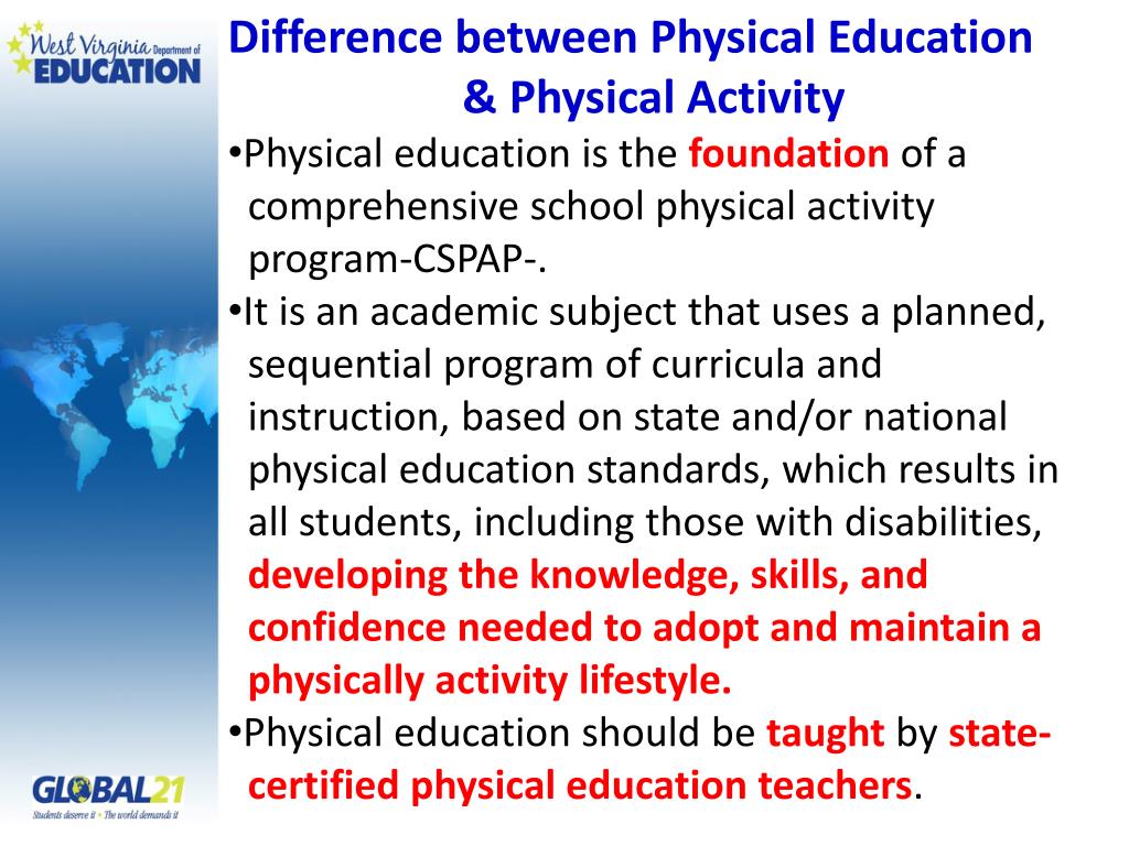 Difference between Physical Education • & Physical Activity • Physical education is the foundation of a • comprehensive school physical activity • program-CSPAP-. • It is an academic subject that uses a planned, • sequential program of curricula and • instruction, based on state and/or national • physical education standards, which results in • all students, including those with disabilities, • developing the knowledge, skills, and • confidence needed to adopt and maintain a • physically activity lifestyle. • Physical education should be taught by state- • certified physical education teachers.