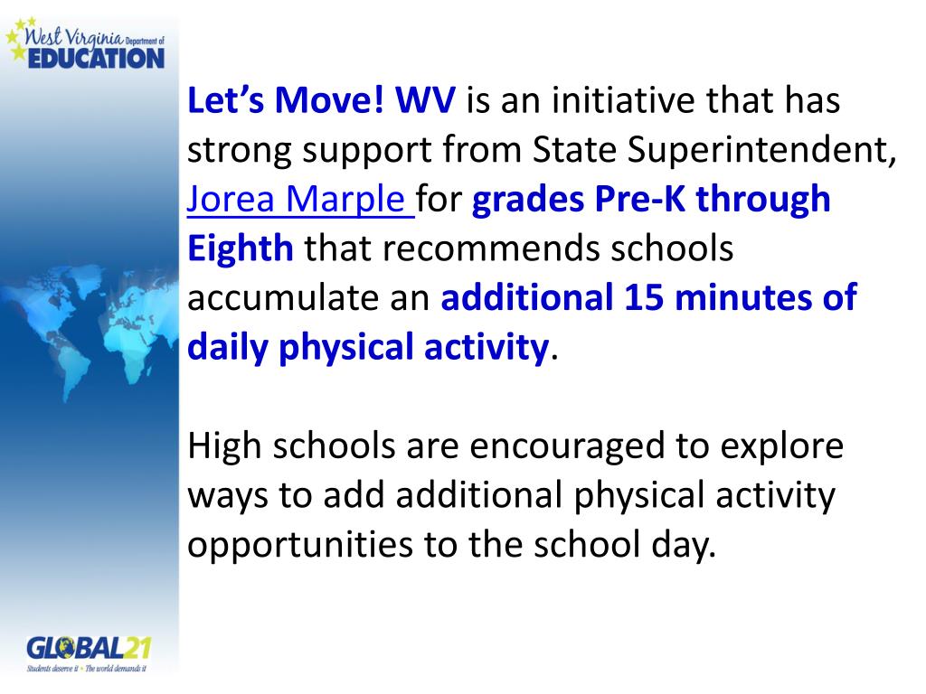 Let’s Move! WV is an initiative that has strong support from State Superintendent, Jorea Marple for grades Pre-K through Eighth that recommends schools accumulate an additional 15 minutes of daily physical activity. High schools are encouraged to explore ways to add additional physical activity opportunities to the school day.