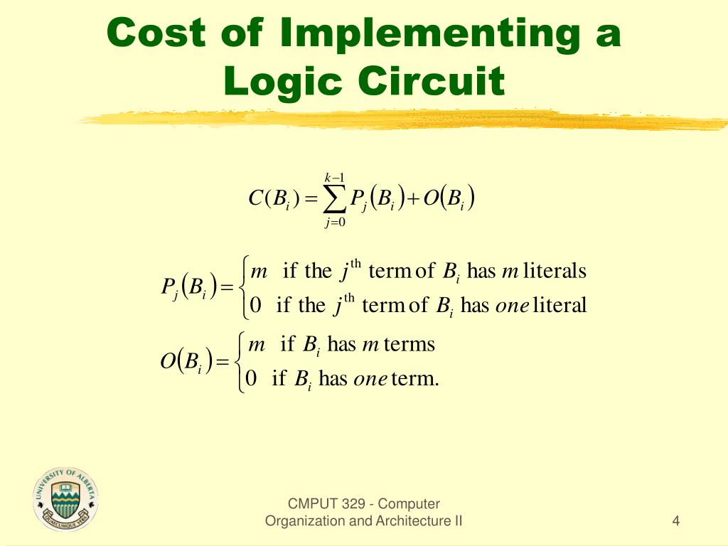 The cost of a boolean equation represented in a sum-of-products form is given by: Cost of Implementing a Logic Circuit The cost of implementing a logic circuit is related to the number of gates used and with the number of inputs in each gate. A literal is a boolean variable or its complement. CMPUT 329 - Computer Organization and Architecture II