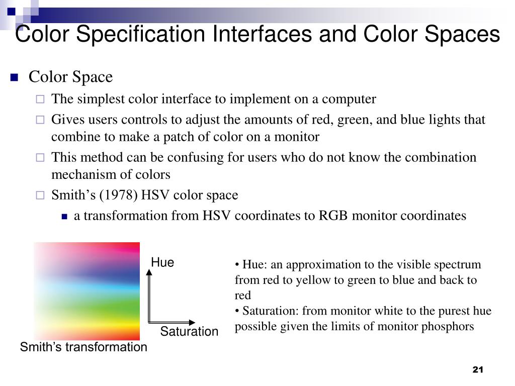 Hue Smith’s transformation Saturation Color Specification Interfaces and Color Spaces • Color Space • The simplest color interface to implement on a computer • Gives users controls to adjust the amounts of red, green, and blue lights that combine to make a patch of color on a monitor • This method can be confusing for users who do not know the combination mechanism of colors • Smith’s (1978) HSV color space • a transformation from HSV coordinates to RGB monitor coordinates • Hue: an approximation to the visible spectrum from red to yellow to green to blue and back to red • Saturation: from monitor white to the purest hue possible given the limits of monitor phosphors
