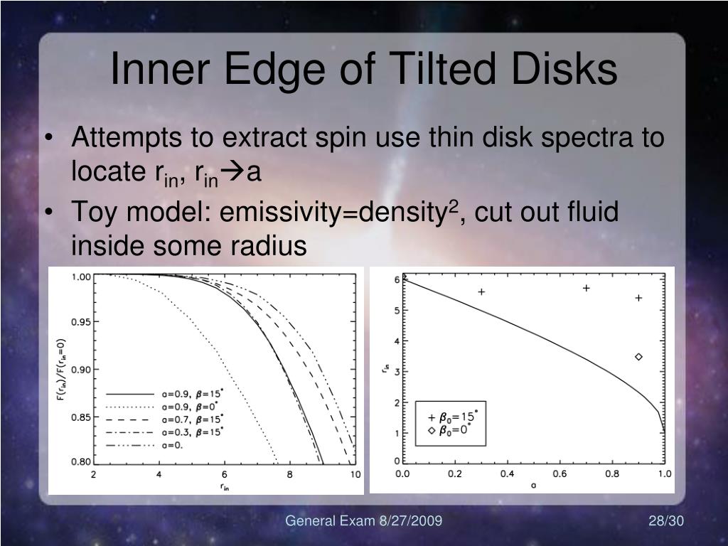 Inner Edge of Tilted Disks • Attempts to extract spin use thin disk spectra to locate rin, rina • Toy model: emissivity=density2, cut out fluid inside some radius General Exam 8/27/2009