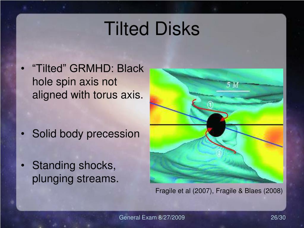 Tilted Disks • “Tilted” GRMHD: Black hole spin axis not aligned with torus axis. • Solid body precession • Standing shocks, plunging streams. Fragile et al (2007), Fragile & Blaes (2008) General Exam 8/27/2009