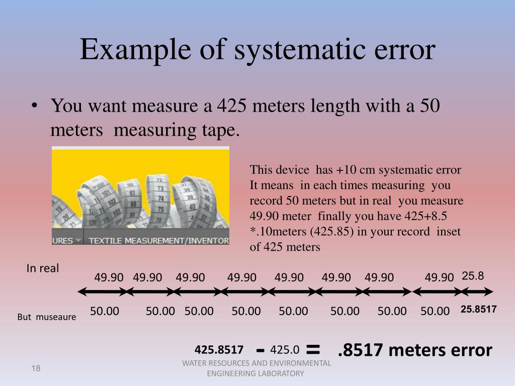 Example of systematic error • You want measure a 425 meters length with a 50 meters measuring tape. This device has +10 cm systematic error It means in each times measuring you record 50 meters but in real you measure 49.90 meter finally you have 425+8.5 *.10meters (425.85) in your record inset of 425 meters In real 25.8 49.90 49.90 49.90 49.90 49.90 49.90 49.90 49.90 But museaure 50.00 50.00 50.00 50.00 50.00 50.00 50.00 50.00 25.8517 - = .8517 meters error 425.8517 425.0 WATER RESOURCES AND ENVIRONMENTAL ENGINEERING LABORATORY