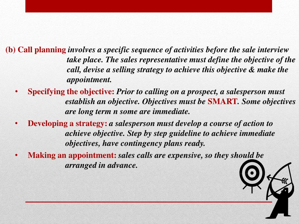 (b) Call planning involves a specific sequence of activities before the sale interview take place. The sales representative must define the objective of the call, devise a selling strategy to achieve this objective & make the appointment. • Specifying the objective: Prior to calling on a prospect, a salesperson must establish an objective. Objectives must be SMART. Some objectives are long term n some are immediate. • Developing a strategy: a salesperson must develop a course of action to achieve objective. Step by step guideline to achieve immediate objectives, have contingency plans ready. • Making an appointment: sales calls are expensive, so they should be arranged in advance.