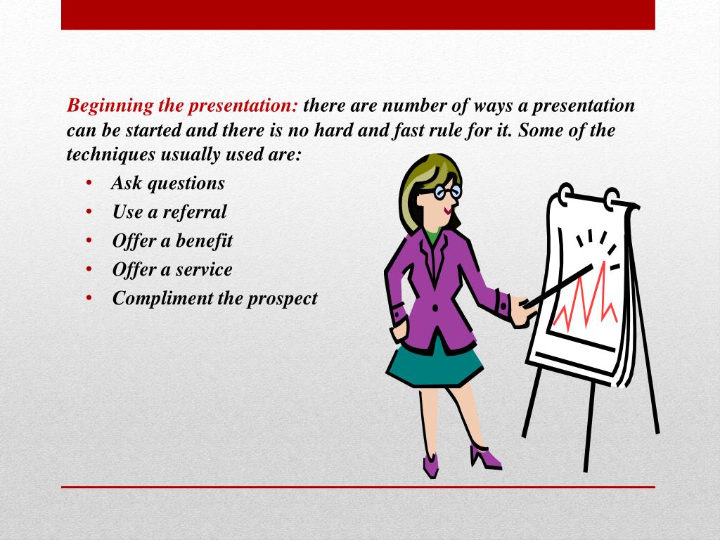 Beginning the presentation:there are number of ways a presentation can be started and there is no hard and fast rule for it. Some of the techniques usually used are: • Ask questions • Use a referral • Offer a benefit • Offer a service • Compliment the prospect