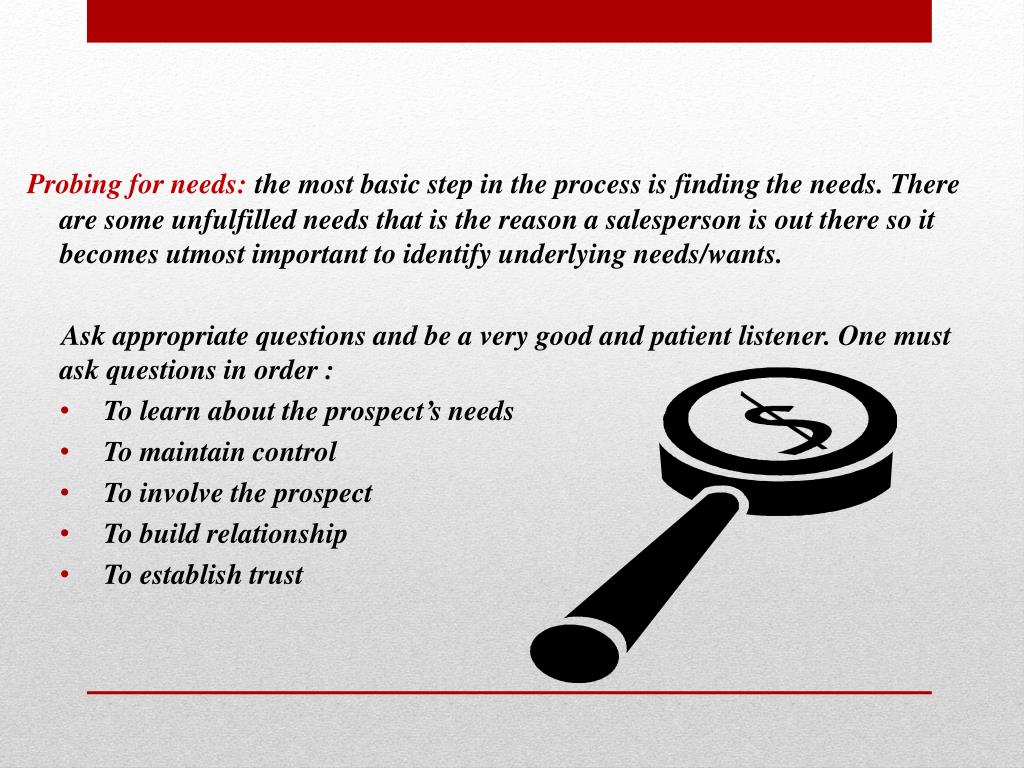 Probing for needs:the most basic step in the process is finding the needs. There are some unfulfilled needs that is the reason a salesperson is out there so it becomes utmost important to identify underlying needs/wants. Ask appropriate questions and be a very good and patient listener. One must ask questions in order : • To learn about the prospect’s needs • To maintain control • To involve the prospect • To build relationship • To establish trust