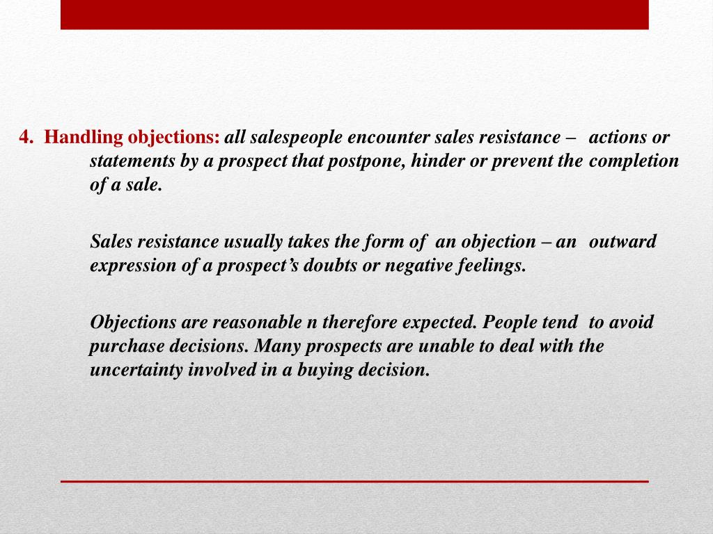 4. Handling objections: all salespeople encounter sales resistance – actions or statements by a prospect that postpone, hinder or prevent the completion of a sale. Sales resistance usually takes the form of an objection – an outward expression of a prospect’s doubts or negative feelings. Objections are reasonable n therefore expected. People tend to avoid purchase decisions. Many prospects are unable to deal with the uncertainty involved in a buying decision.
