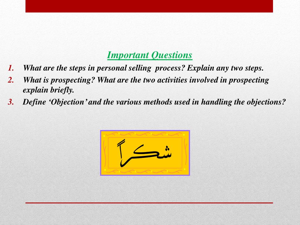 Important Questions • What are the steps in personal selling process? Explain any two steps. • What is prospecting? What are the two activities involved in prospecting explain briefly. • Define ‘Objection’ and the various methods used in handling the objections?