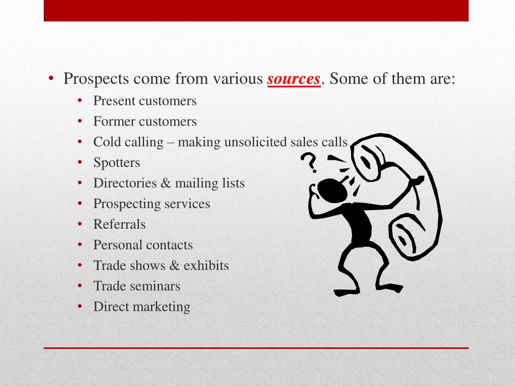 Prospects come from various sources. Some of them are: • Present customers • Former customers • Cold calling – making unsolicited sales calls • Spotters • Directories & mailing lists • Prospecting services • Referrals • Personal contacts • Trade shows & exhibits • Trade seminars • Direct marketing