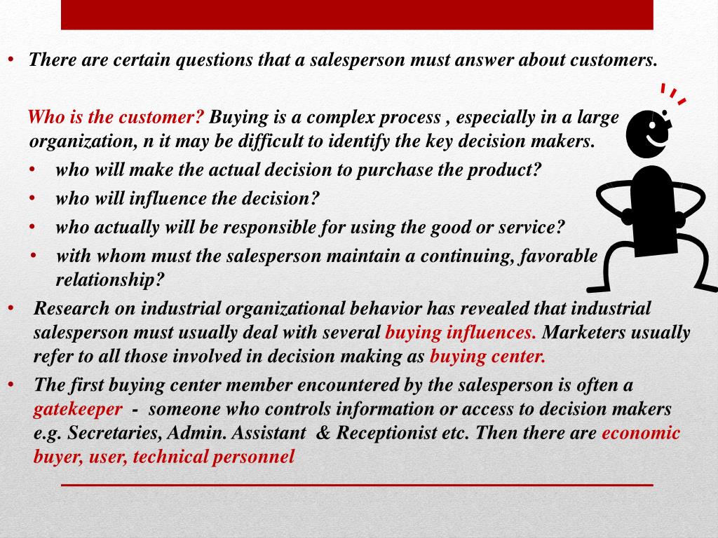 There are certain questions that a salesperson must answer about customers. Who is the customer? Buying is a complex process , especially in a large organization, n it may be difficult to identify the key decision makers. • who will make the actual decision to purchase the product? • who will influence the decision? • who actually will be responsible for using the good or service? • with whom must the salesperson maintain a continuing, favorable relationship? • Research on industrial organizational behavior has revealed that industrial salesperson must usually deal with several buying influences. Marketers usually refer to all those involved in decision making as buying center. • The first buying center member encountered by the salesperson is often a gatekeeper - someone who controls information or access to decision makers e.g. Secretaries, Admin. Assistant & Receptionist etc. Then there are economic buyer, user, technical personnel