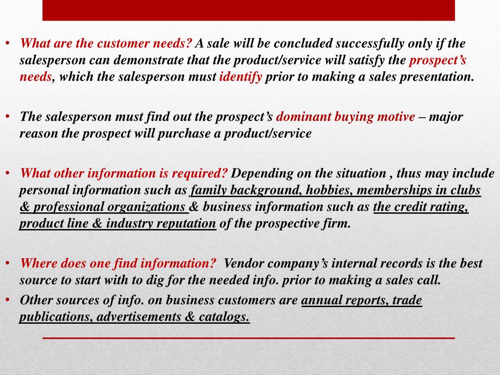 What are the customer needs? A sale will be concluded successfully only if the salesperson can demonstrate that the product/service will satisfy the prospect’s needs, which the salesperson must identify prior to making a sales presentation. • The salesperson must find out the prospect’s dominant buying motive –major reason the prospect will purchase a product/service • What other information is required? Depending on the situation , thus may include personal information such as family background, hobbies, memberships in clubs & professional organizations & business information such as the credit rating, product line & industry reputationof the prospective firm. • Where does one find information? Vendor company’s internal records is the best source to start with to dig for the needed info. prior to making a sales call. • Other sources of info. on business customers are annual reports, trade publications, advertisements & catalogs.