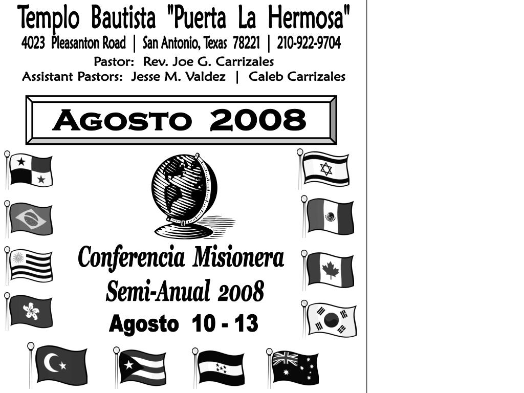 Templo Bautista "Puerta La Hermosa". 4023 Pleasanton Road | San Antonio, Texas 78221 | 210-922-9704. Pastor: Rev. Joe G. Carrizales Assistant Pastors: Jesse M. Valdez | Caleb Carrizales. Agosto 2008. Conferencia Misionera Semi-Anual 2008. Agosto 10 - 13.