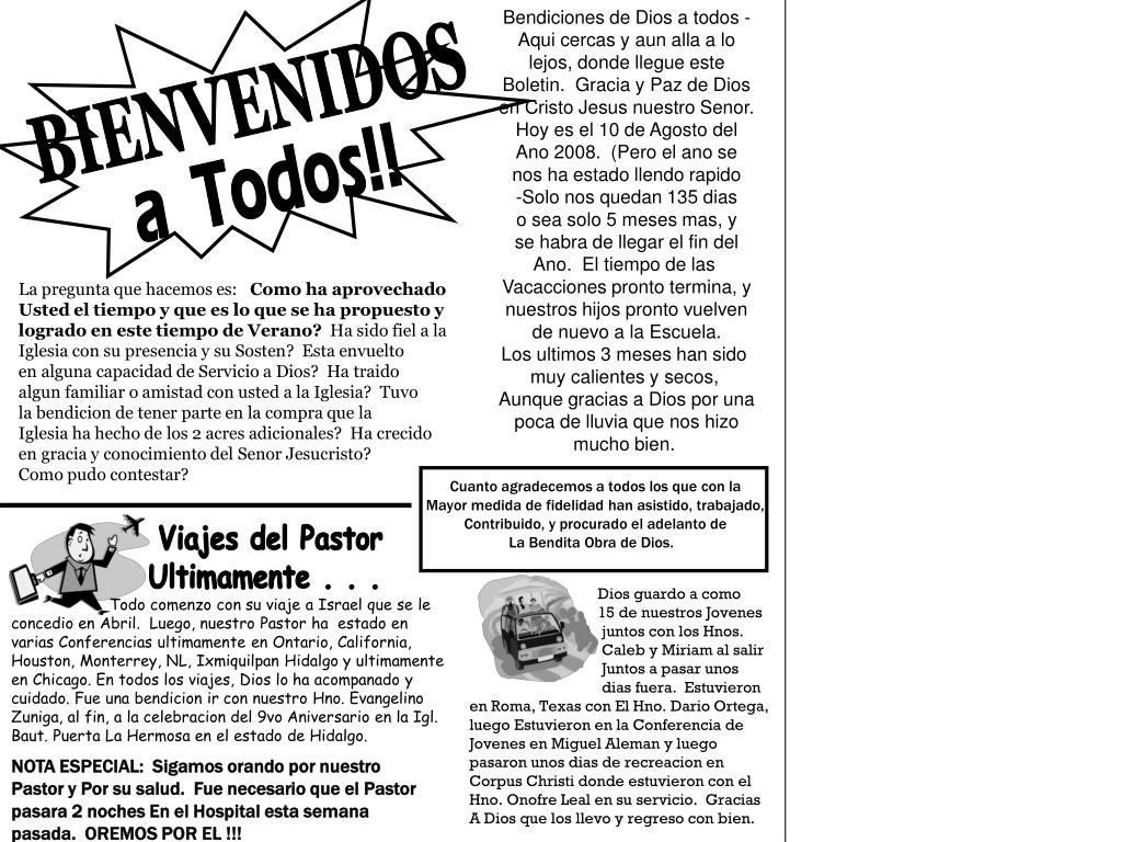 Bendiciones de Dios a todos - • Aqui cercas y aun alla a lo • lejos, donde llegue este • Boletin. Gracia y Paz de Dios • en Cristo Jesus nuestro Senor. • Hoy es el 10 de Agosto del • Ano 2008. (Pero el ano se • nos ha estado llendo rapido • Solo nos quedan 135 dias • o sea solo 5 meses mas, y • se habra de llegar el fin del • Ano. El tiempo de las • Vacacciones pronto termina, y • nuestros hijos pronto vuelven • de nuevo a la Escuela. • Los ultimos 3 meses han sido • muy calientes y secos, • Aunque gracias a Dios por una • poca de lluvia que nos hizo • mucho bien. BIENVENIDOS a Todos!! La pregunta que hacemos es: Como ha aprovechado Usted el tiempo y que es lo que se ha propuesto y logrado en este tiempo de Verano? Ha sido fiel a la Iglesia con su presencia y su Sosten? Esta envuelto en alguna capacidad de Servicio a Dios? Ha traido algun familiar o amistad con usted a la Iglesia? Tuvo la bendicion de tener parte en la compra que la Iglesia ha hecho de los 2 acres adicionales? Ha crecido en gracia y conocimiento del Senor Jesucristo? Como pudo contestar? Cuanto agradecemos a todos los que con la Mayor medida de fidelidad han asistido, trabajado, Contribuido, y procurado el adelanto de La Bendita Obra de Dios. Viajes del Pastor Ultimamente . . . Dios guardo a como 15 de nuestros Jovenes juntos con los Hnos. Caleb y Miriam al salir Juntos a pasar unos dias fuera. Estuvieron en Roma, Texas con El Hno. Dario Ortega, luego Estuvieron en la Conferencia de Jovenes en Miguel Aleman y luego pasaron unos dias de recreacion en Corpus Christi donde estuvieron con el Hno. Onofre Leal en su servicio. Gracias A Dios que los llevo y regreso con bien. Todo comenzo con su viaje a Israel que se le concedio en Abril. Luego, nuestro Pastor ha estado en varias Conferencias ultimamente en Ontario, California, Houston, Monterrey, NL, Ixmiquilpan Hidalgo y ultimamente en Chicago. En todos los viajes, Dios lo ha acompanado y cuidado. Fue una bendicion ir con nuestro Hno. Evangelino Zuniga, al fin, a la celebracion del 9vo Aniversario en la Igl. Baut. Puerta La Hermosa en el estado de Hidalgo. NOTA ESPECIAL: Sigamos orando por nuestro Pastor y Por su salud. Fue necesario que el Pastor pasara 2 noches En el Hospital esta semana pasada. OREMOS POR EL !!!