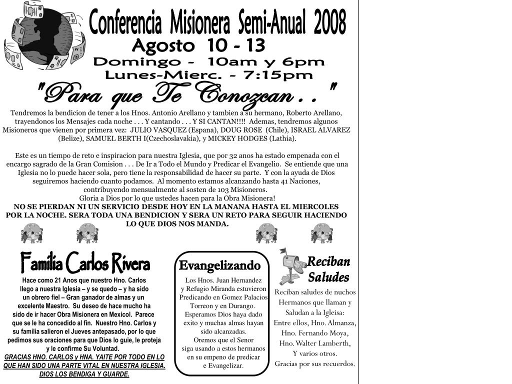 Conferencia Misionera Semi-Anual 2008 Agosto 10 - 13 Domingo - 10am y 6pm Lunes-Mierc. - 7:15pm "Para que Te Conozcan . ." Tendremos la bendicion de tener a los Hnos. Antonio Arellano y tambien a su hermano, Roberto Arellano, trayendonos los Mensajes cada noche . . . Y cantando . . . Y SI CANTAN!!!! Ademas, tendremos algunos Misioneros que vienen por primera vez: JULIO VASQUEZ (Espana), DOUG ROSE (Chile), ISRAEL ALVAREZ (Belize), SAMUEL BERTH I(Czechoslavakia), y MICKEY HODGES (Lathia). Este es un tiempo de reto e inspiracion para nuestra Iglesia, que por 32 anos ha estado empenada con el encargo sagrado de la Gran Comision . . . De Ir a Todo el Mundo y Predicar el Evangelio. Se entiende que una Iglesia no lo puede hacer sola, pero tiene la responsabilidad de hacer su parte. Y con la ayuda de Dios seguiremos haciendo cuanto podamos. Al momento estamos alcanzando hasta 41 Naciones, contribuyendo mensualmente al sosten de 103 Misioneros. Gloria a Dios por lo que ustedes hacen para la Obra Misionera! NO SE PIERDAN NI UN SERVICIO DESDE HOY EN LA MANANA HASTA EL MIERCOLES POR LA NOCHE. SERA TODA UNA BENDICION Y SERA UN RETO PARA SEGUIR HACIENDO LO QUE DIOS NOS MANDA. Familia Carlos Rivera Reciban Saludes Evangelizando Hace como 21 Anos que nuestro Hno. Carlos llego a nuestra Iglesia – y se quedo – y ha sido un obrero fiel – Gran ganador de almas y un excelente Maestro. Su deseo de hace mucho ha sido de ir hacer Obra Misionera en Mexicol. Parece que se le ha concedido al fin. Nuestro Hno. Carlos y su familia salieron el Jueves antepasado, por lo que pedimos sus oraciones para que Dios lo guie, le proteja y le confirme Su Voluntad. GRACIAS HNO. CARLOS y HNA. YAITE POR TODO EN LO QUE HAN SIDO UNA PARTE VITAL EN NUESTRA IGLESIA. DIOS LOS BENDIGA Y GUARDE. Los Hnos. Juan Hernandez y Refugio Miranda estuvieron Predicando en Gomez Palacios Torreon y en Durango. Esperamos Dios haya dado exito y muchas almas hayan sido alcanzadas. Oremos que el Senor siga usando a estos hermanos en su empeno de predicar e Evangelizar. Reciban saludes de nuchos Hermanos que llaman y Saludan a la Igleisa: Entre ellos, Hno. Almanza, Hno. Fernando Moya, Hno. Walter Lamberth, Y varios otros. Gracias por sus recuerdos.