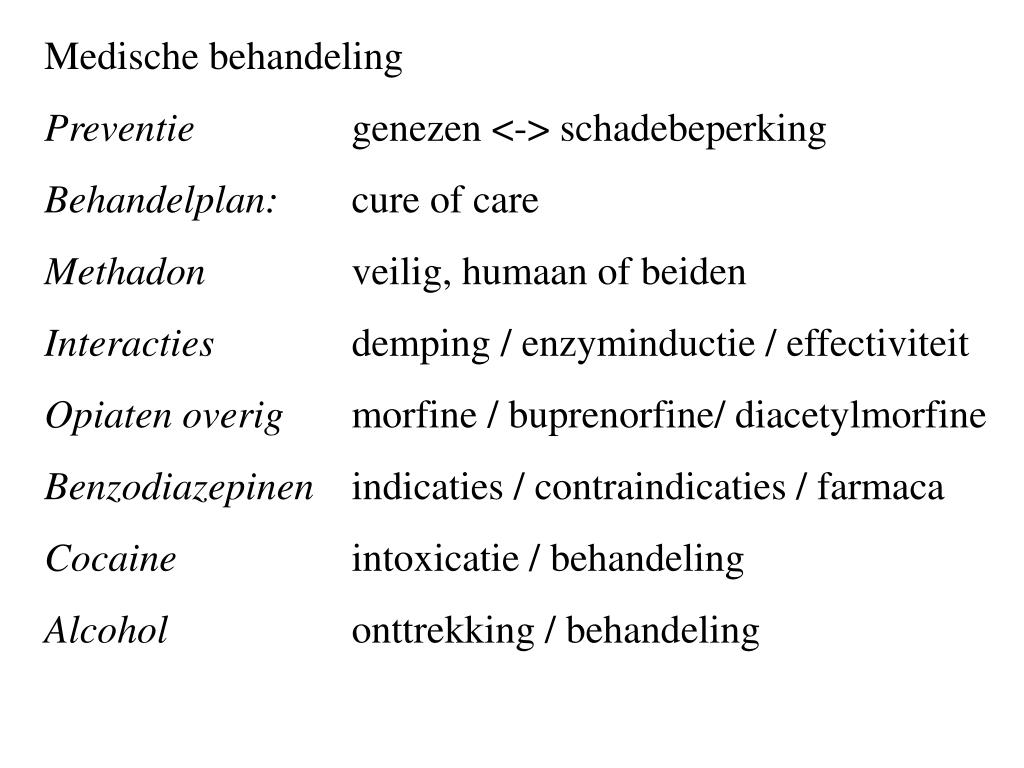 Medische behandeling Preventie genezen <-> schadebeperking Behandelplan: cure of care Methadon veilig, humaan of beiden Interacties demping / enzyminductie / effectiviteit Opiaten overig morfine / buprenorfine/ diacetylmorfine Benzodiazepinen indicaties / contraindicaties / farmaca Cocaine intoxicatie / behandeling Alcohol onttrekking / behandeling