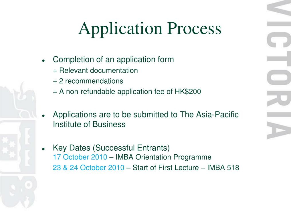 Application Process • Completion of an application form + Relevant documentation + 2 recommendations + A non-refundable application fee of HK$200 • Applications are to be submitted to The Asia-Pacific Institute of Business • Key Dates (Successful Entrants)17 October 2010 – IMBA Orientation Programme 23 & 24 October 2010 – Start of First Lecture – IMBA 518