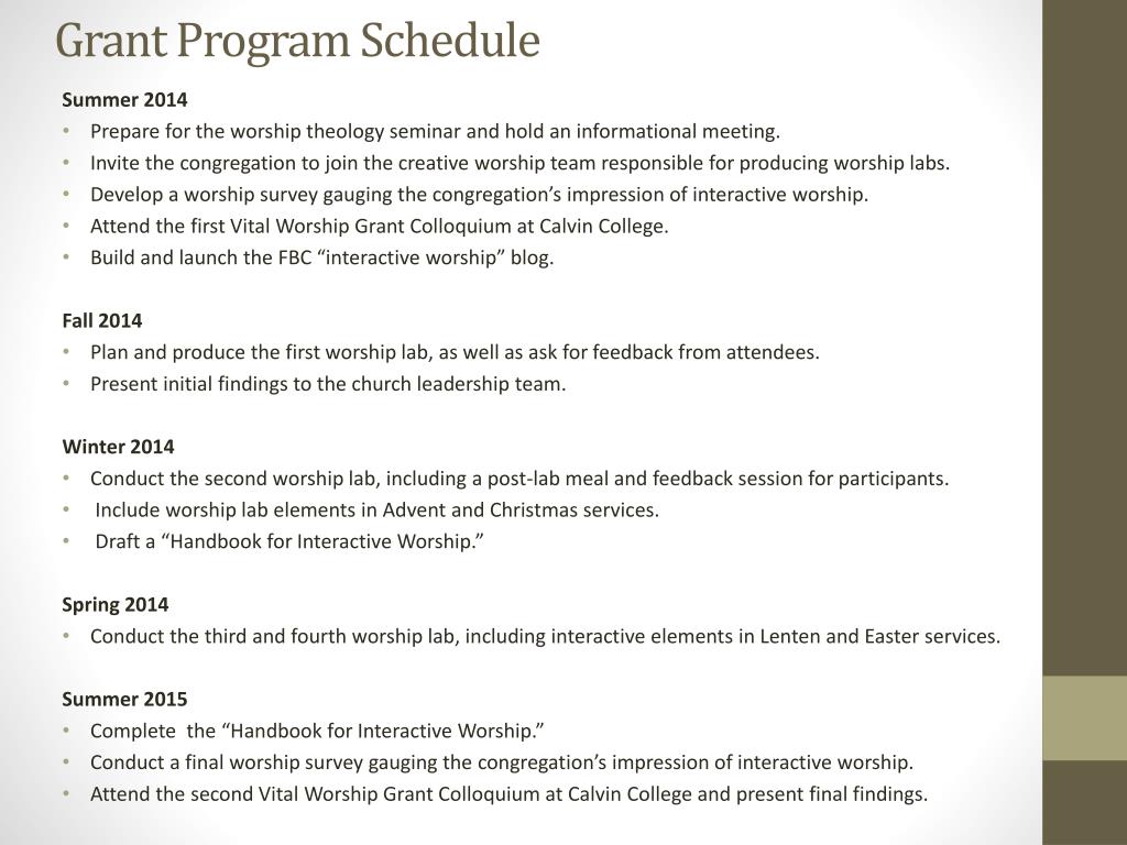 Grant Program Schedule Summer 2014 • Prepare for the worship theology seminar and hold an informational meeting. • Invite the congregation to join the creative worship team responsible for producing worship labs. • Develop a worship survey gauging the congregation’s impression of interactive worship. • Attend the first Vital Worship Grant Colloquium at Calvin College. • Build and launch the FBC “interactive worship” blog. Fall 2014 • Plan and produce the first worship lab, as well as ask for feedback from attendees. • Present initial findings to the church leadership team. Winter 2014 • Conduct the second worship lab, including a post-lab meal and feedback session for participants. • Include worship lab elements in Advent and Christmas services. • Draft a “Handbook for Interactive Worship.” Spring 2014 • Conduct the third and fourth worship lab, including interactive elements in Lenten and Easter services. Summer 2015 • Complete the “Handbook for Interactive Worship.” • Conduct a final worship survey gauging the congregation’s impression of interactive worship. • Attend the second Vital Worship Grant Colloquium at Calvin College and present final findings.