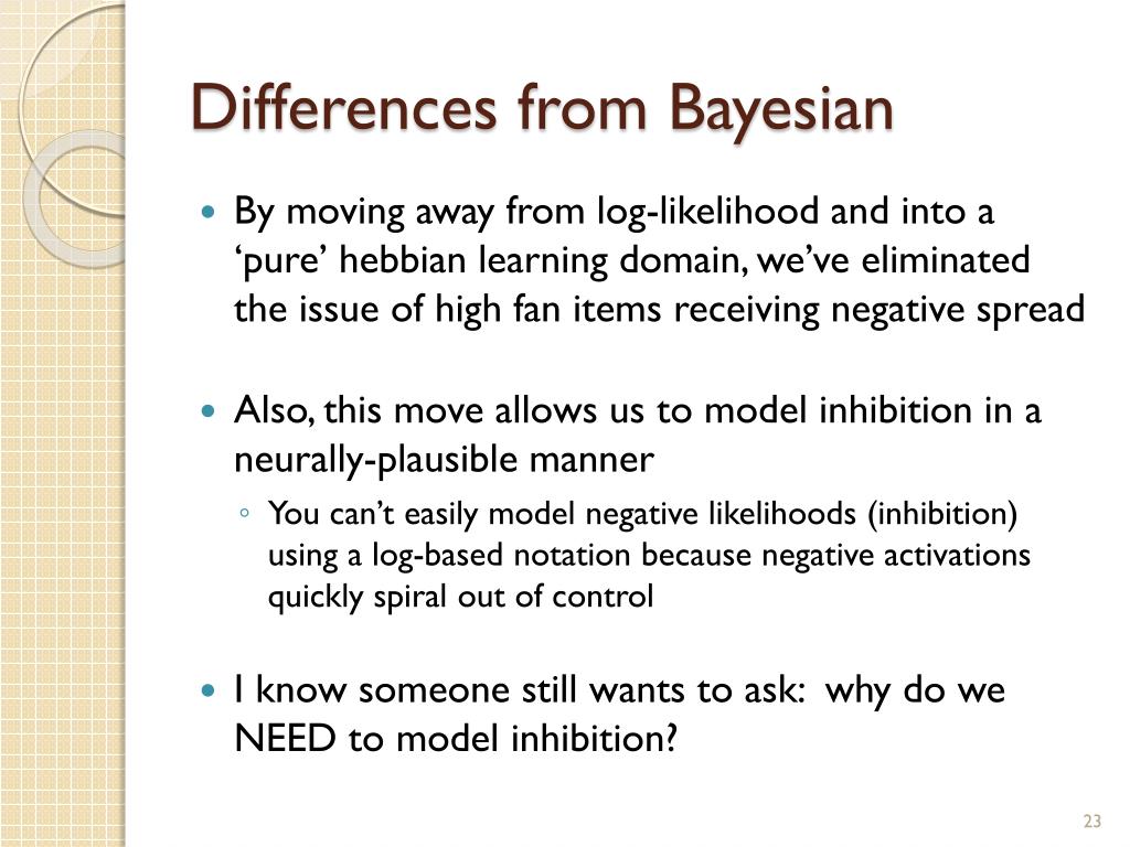 Differences from Bayesian • By moving away from log-likelihood and into a ‘pure’ hebbian learning domain, we’ve eliminated the issue of high fan items receiving negative spread • Also, this move allows us to model inhibition in a neurally-plausible manner • You can’t easily model negative likelihoods (inhibition) using a log-based notation because negative activations quickly spiral out of control • I know someone still wants to ask: why do we NEED to model inhibition?