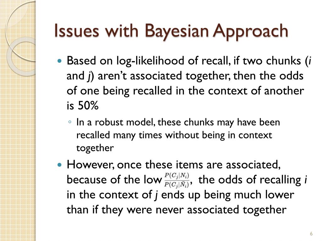 Issues with Bayesian Approach • Based on log-likelihood of recall, if two chunks (i and j) aren’t associated together, then the odds of one being recalled in the context of another is 50% • In a robust model, these chunks may have been recalled many times without being in context together • However, once these items are associated, because of the low , the odds of recalling i in the context of j ends up being much lower than if they were never associated together