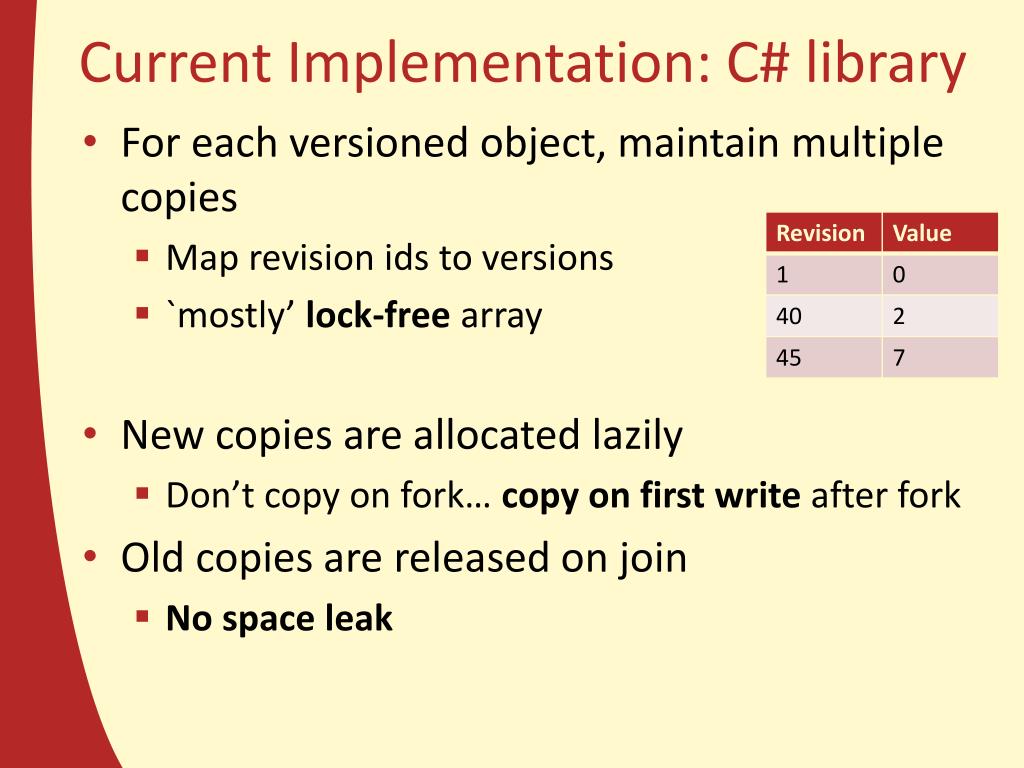 Current Implementation: C# library • For each versioned object, maintain multiple copies • Map revision ids to versions • `mostly’ lock-free array • New copies are allocated lazily • Don’t copy on fork… copy on first write after fork • Old copies are released on join • No space leak