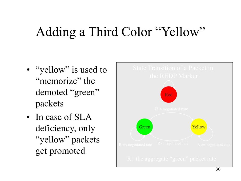 Adding a Third Color “Yellow” • “yellow” is used to “memorize” the demoted “green” packets • In case of SLA deficiency, only “yellow” packets get promoted State Transition of a Packet in the REDP Marker Red R > negotiated rate Green Yellow R < negotiated rate R =< negotiated rate R >= negotiated rate R: the aggregate “green” packet rate