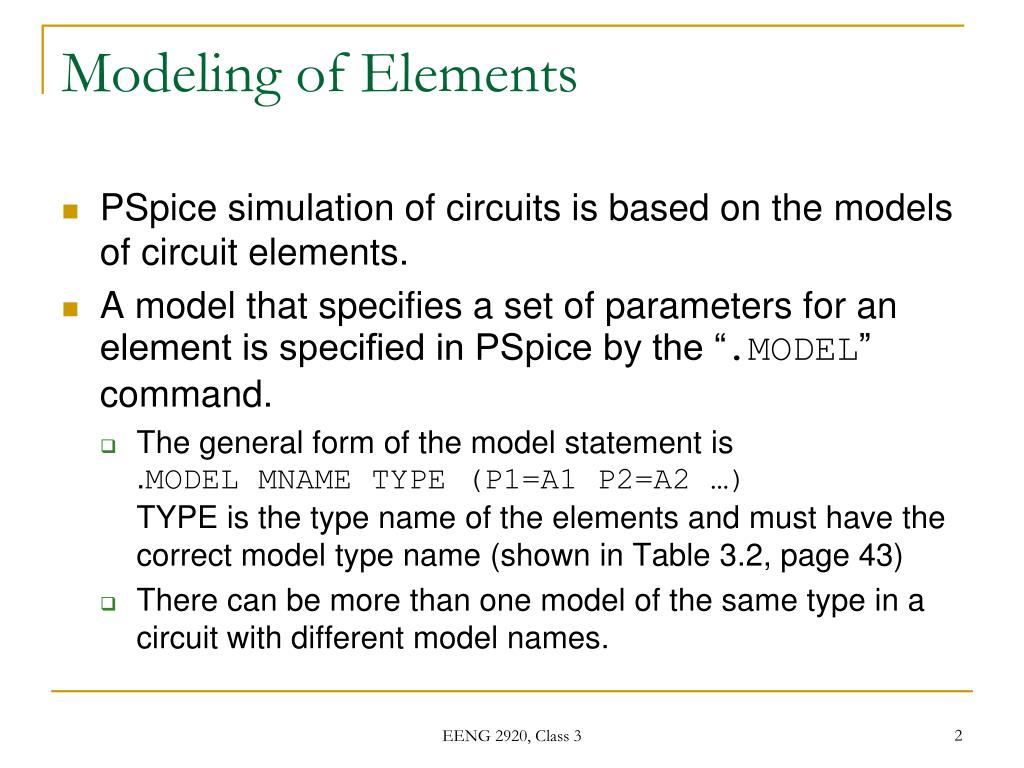 Modeling of Elements • PSpice simulation of circuits is based on the models of circuit elements. • A model that specifies a set of parameters for an element is specified in PSpice by the “.MODEL” command. • The general form of the model statement is.MODEL MNAME TYPE (P1=A1 P2=A2 …)TYPE is the type name of the elements and must have the correct model type name (shown in Table 3.2, page 43) • There can be more than one model of the same type in a circuit with different model names. EENG 2920, Class 3