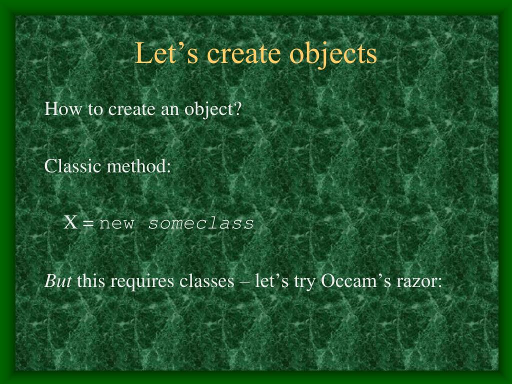 Let’s create objects How to create an object? Classic method: X = new someclass But this requires classes – let’s try Occam’s razor: