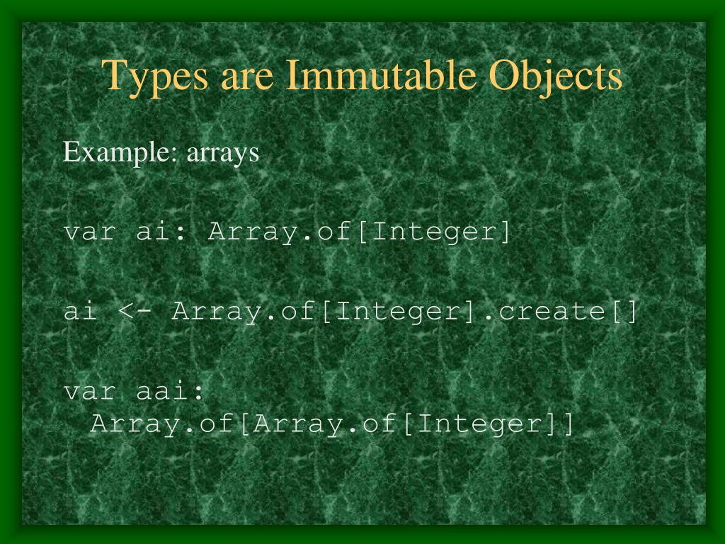 Types are Immutable Objects Example: arrays varai: Array.of[Integer] ai <- Array.of[Integer].create[] varaai: Array.of[Array.of[Integer]]
