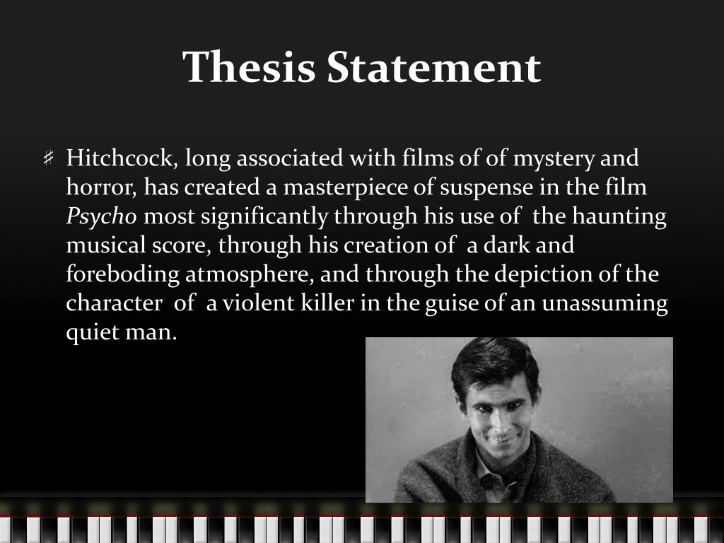 Thesis Statement • Hitchcock, long associated with films of of mystery and horror, has created a masterpiece of suspense in the film Psycho most significantly through his use of the haunting musical score, through his creation of a dark and foreboding atmosphere, and through the depiction of the character of a violent killer in the guise of an unassuming quiet man.