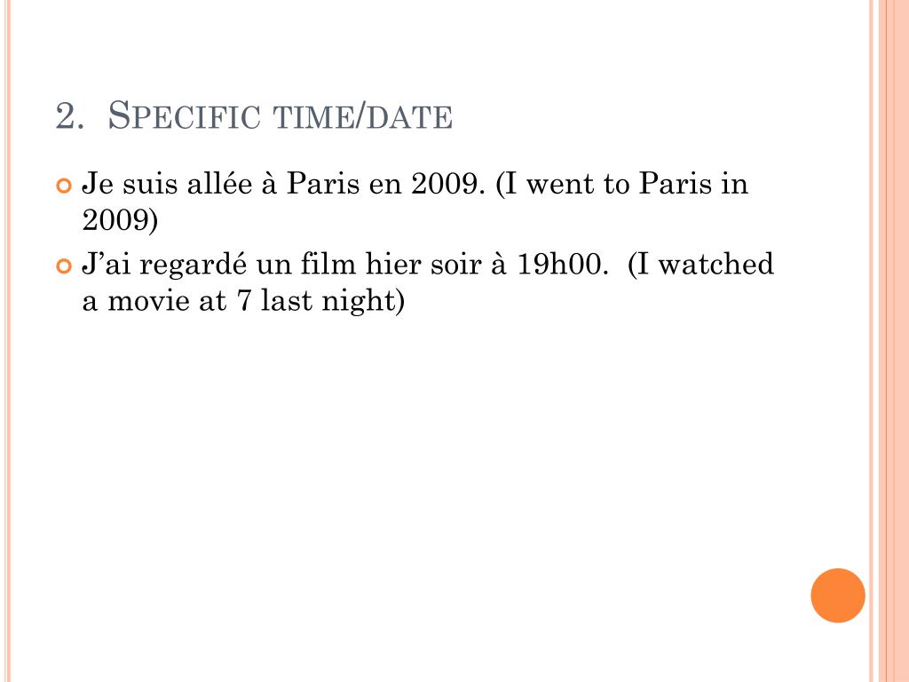 2. Specific time/date • Je suis allée à Paris en 2009. (I went to Paris in 2009) • J’ai regardé un film hier soir à 19h00. (I watched a movieat 7 last night)