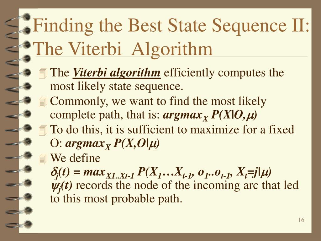 Finding the Best State Sequence II: The Viterbi Algorithm • The Viterbi algorithm efficiently computes the most likely state sequence. • Commonly, we want to find the most likely complete path, that is: argmaxX P(X|O,) • To do this, it is sufficient to maximize for a fixed O: argmaxX P(X,O|) • We define j(t) = maxX1..Xt-1 P(X1…Xt-1, o1..ot-1, Xt=j|) j(t) records the node of the incoming arc that led to this most probable path.