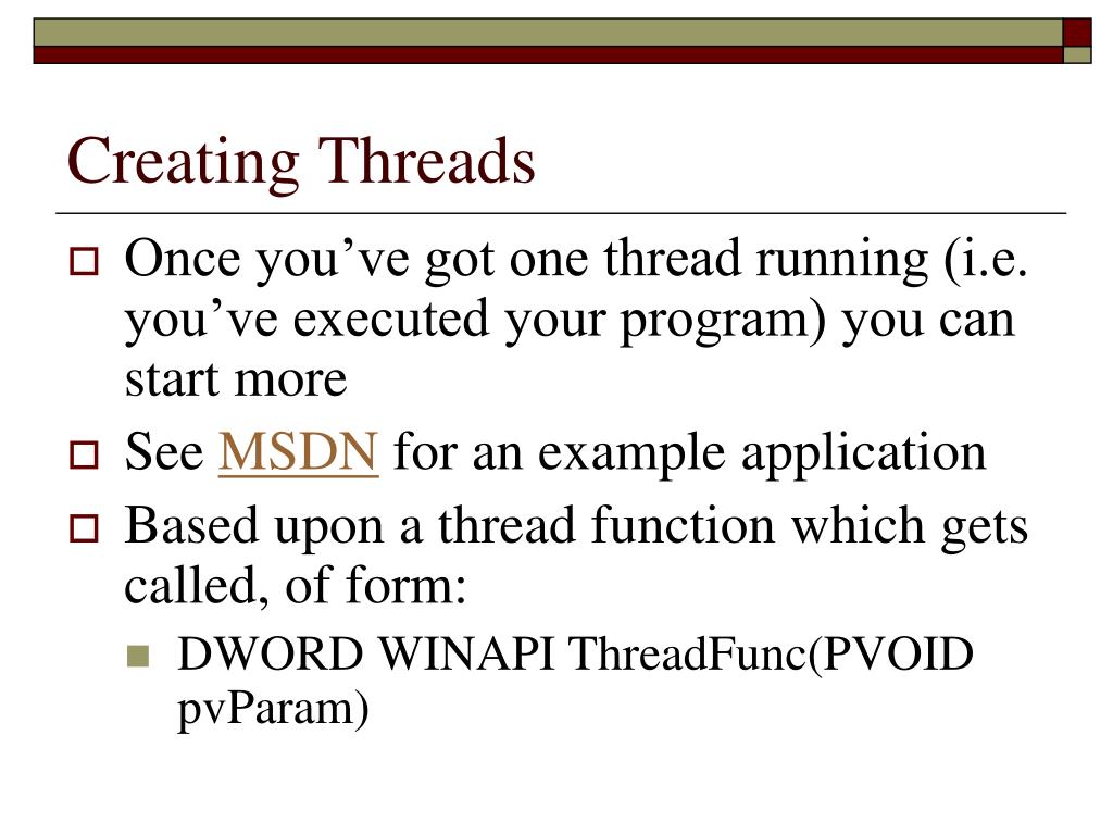 Creating Threads • Once you’ve got one thread running (i.e. you’ve executed your program) you can start more • See MSDN for an example application • Based upon a thread function which gets called, of form: • DWORD WINAPI ThreadFunc(PVOID pvParam)