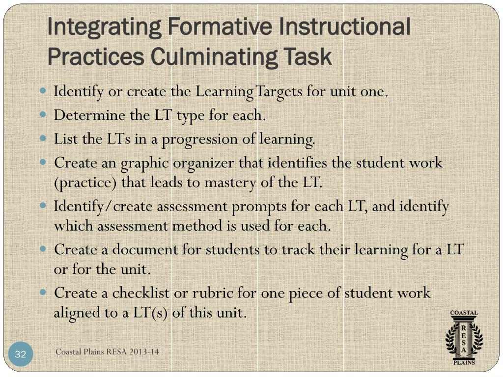Integrating Formative Instructional Practices Culminating Task • Identify or create the Learning Targets for unit one. • Determine the LT type for each. • List the LTs in a progression of learning. • Create an graphic organizer that identifies the student work (practice) that leads to mastery of the LT. • Identify/create assessment prompts for each LT, and identify which assessment method is used for each. • Create a document for students to track their learning for a LT or for the unit. • Create a checklist or rubric for one piece of student work aligned to a LT(s) of this unit. Coastal Plains RESA 2013-14
