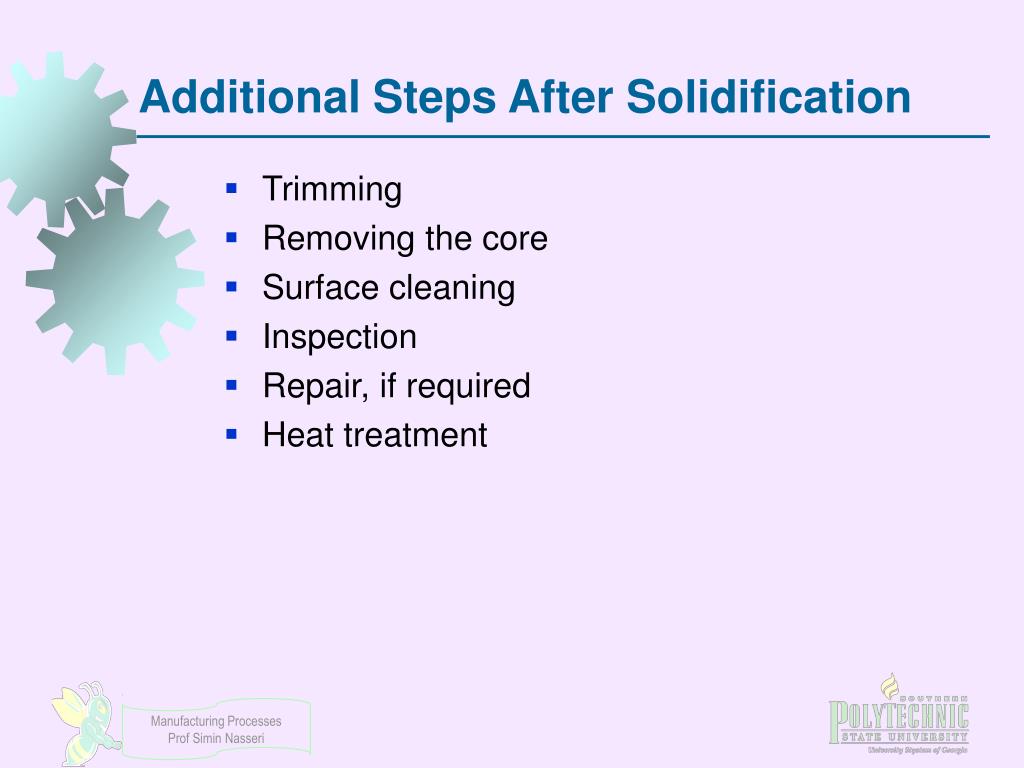 Additional Steps After Solidification • Trimming • Removing the core • Surface cleaning • Inspection • Repair, if required • Heat treatment