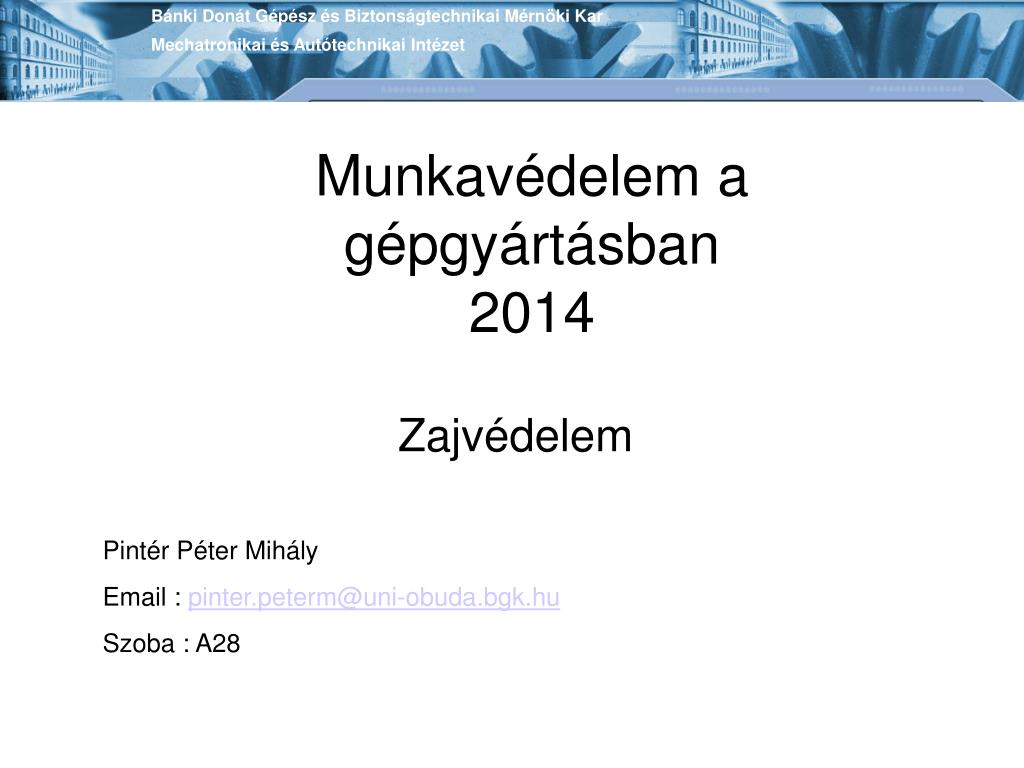 Bánki Donát Gépész és Biztonságtechnikai Mérnöki KarMechatronikai és Autótechnikai Intézet Munkavédelem a gépgyártásban 2014 Zajvédelem Pintér Péter Mihály Email : pinter.peterm@uni-obuda.bgk.hu Szoba : A28