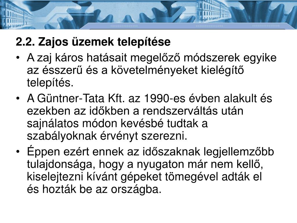 2.2. Zajos üzemek telepítése • A zaj káros hatásait megelőző módszerek egyike az ésszerű és a követelményeket kielégítő telepítés. • A Güntner-Tata Kft. az 1990-es évben alakult és ezekben az időkben a rendszerváltás után sajnálatos módon kevésbé tudtak a szabályoknak érvényt szerezni. • Éppen ezért ennek az időszaknak legjellemzőbb tulajdonsága, hogy a nyugaton már nem kellő, kiselejtezni kívánt gépeket tömegével adták el és hozták be az országba.