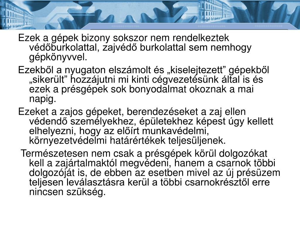 Ezek a gépek bizony sokszor nem rendelkeztek védőburkolattal, zajvédő burkolattal sem nemhogy gépkönyvvel. Ezekből a nyugaton elszámolt és „kiselejtezett” gépekből „sikerült” hozzájutni mi kinti cégvezetésünk által is és ezek a présgépek sok bonyodalmat okoznak a mai napig. Ezeket a zajos gépeket, berendezéseket a zaj ellen védendő személyekhez, épületekhez képest úgy kellett elhelyezni, hogy az előírt munkavédelmi, környezetvédelmi határértékek teljesüljenek. Természetesen nem csak a présgépek körül dolgozókat kell a zajártalmaktól megvédeni, hanem a csarnok többi dolgozóját is, de ebben az esetben mivel az új présüzem teljesen leválasztásra kerül a többi csarnokrésztől erre nincsen szükség.