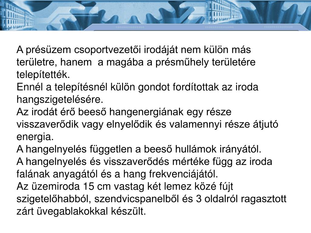 A présüzem csoportvezetői irodáját nem külön más területre, hanem a magába a présműhely területére telepítették.Ennél a telepítésnél külön gondot fordítottak az iroda hangszigetelésére. Az irodát érő beeső hangenergiának egy része visszaverődik vagy elnyelődik és valamennyi része átjutó energia. A hangelnyelés független a beeső hullámok irányától. A hangelnyelés és visszaverődés mértéke függ az iroda falának anyagától és a hang frekvenciájától. Az üzemiroda 15 cm vastag két lemez közé fújt szigetelőhabból, szendvicspanelből és 3 oldalról ragasztott zárt üvegablakokkal készült.