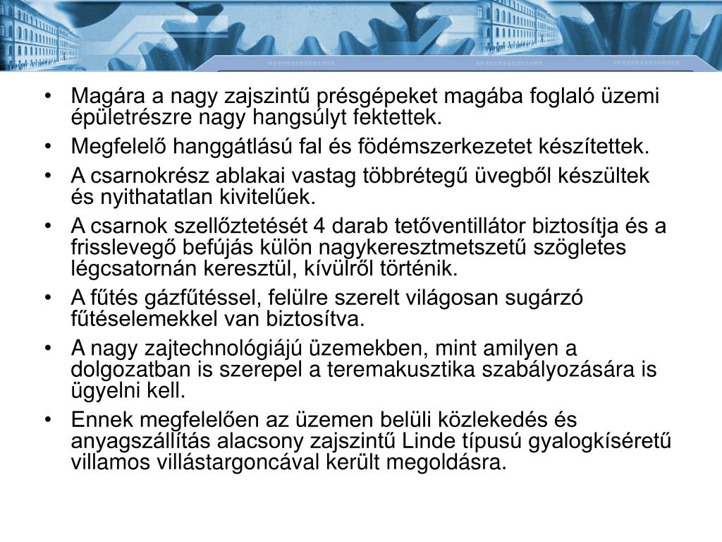 Magára a nagy zajszintű présgépeket magába foglaló üzemi épületrészre nagy hangsúlyt fektettek. • Megfelelő hanggátlású fal és födémszerkezetet készítettek. • A csarnokrész ablakai vastag többrétegű üvegből készültek és nyithatatlan kivitelűek. • A csarnok szellőztetését 4 darab tetőventillátor biztosítja és a frisslevegő befújás külön nagykeresztmetszetű szögletes légcsatornán keresztül, kívülről történik. • A fűtés gázfűtéssel, felülre szerelt világosan sugárzó fűtéselemekkel van biztosítva. • A nagy zajtechnológiájú üzemekben, mint amilyen a dolgozatban is szerepel a teremakusztika szabályozására is ügyelni kell. • Ennek megfelelően az üzemen belüli közlekedés és anyagszállítás alacsony zajszintű Linde típusú gyalogkíséretű villamos villástargoncával került megoldásra.
