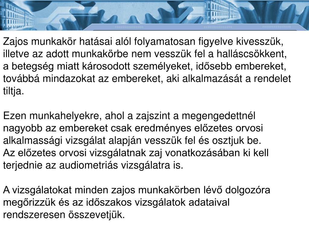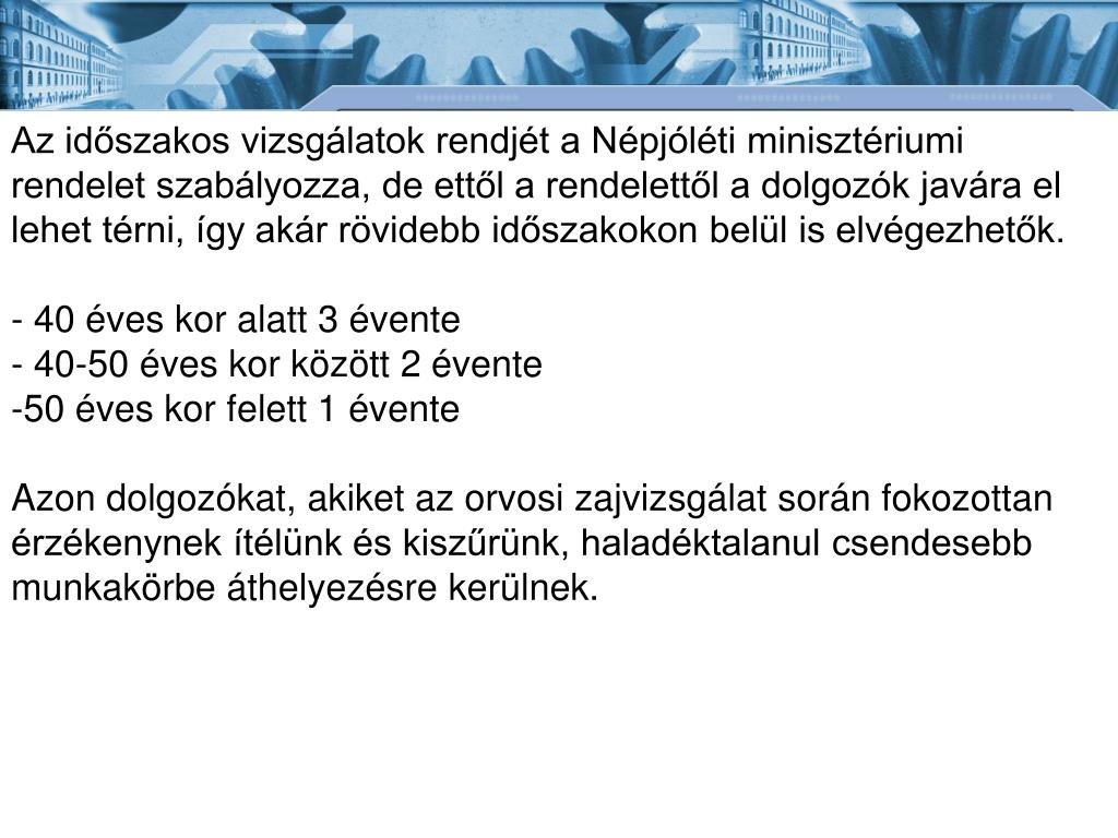 Az időszakos vizsgálatok rendjét a Népjóléti minisztériumi rendelet szabályozza, de ettől a rendelettől a dolgozók javára el lehet térni, így akár rövidebb időszakokon belül is elvégezhetők. - 40 éves kor alatt 3 évente - 40-50 éves kor között 2 évente • 50 éves kor felett 1 évente Azon dolgozókat, akiket az orvosi zajvizsgálat során fokozottan érzékenynek ítélünk és kiszűrünk, haladéktalanul csendesebb munkakörbe áthelyezésre kerülnek.