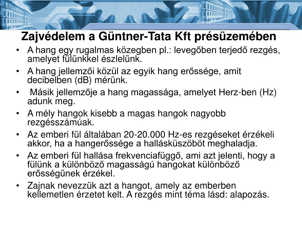 Zajvédelem a Güntner-Tata Kft présüzemében • A hang egy rugalmas közegben pl.: levegőben terjedő rezgés, amelyet fülünkkel észlelünk. • A hang jellemzői közül az egyik hang erőssége, amit decibelben (dB) mérünk. • Másik jellemzője a hang magassága, amelyet Herz-ben (Hz) adunk meg. • A mély hangok kisebb a magas hangok nagyobb rezgésszámúak. • Az emberi fül általában 20-20.000 Hz-es rezgéseket érzékeli akkor, ha a hangerőssége a hallásküszöböt meghaladja. • Az emberi fül hallása frekvenciafüggő, ami azt jelenti, hogy a fülünk a különböző magasságú hangokat különböző erősségűnek érzékel. • Zajnak nevezzük azt a hangot, amely az emberben kellemetlen érzetet kelt. A rezgés mint téma lásd: alapozás.