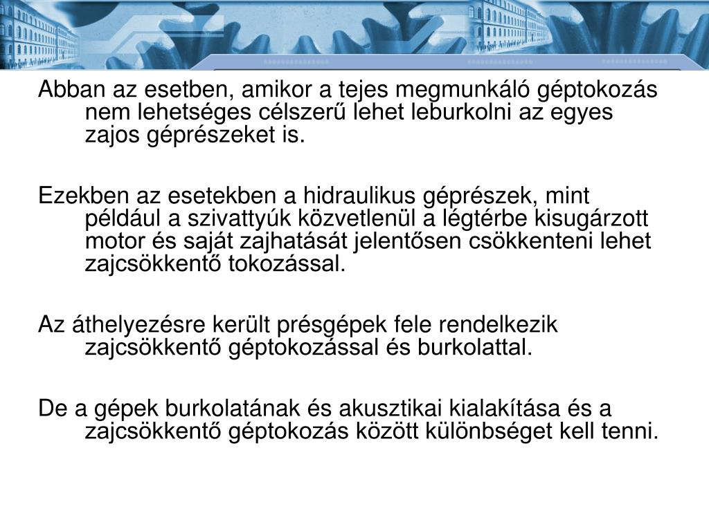 Abban az esetben, amikor a tejes megmunkáló géptokozás nem lehetséges célszerű lehet leburkolni az egyes zajos géprészeket is. Ezekben az esetekben a hidraulikus géprészek, mint például a szivattyúk közvetlenül a légtérbe kisugárzott motor és saját zajhatását jelentősen csökkenteni lehet zajcsökkentő tokozással. Az áthelyezésre került présgépek fele rendelkezik zajcsökkentő géptokozással és burkolattal. De a gépek burkolatának és akusztikai kialakítása és a zajcsökkentő géptokozás között különbséget kell tenni.