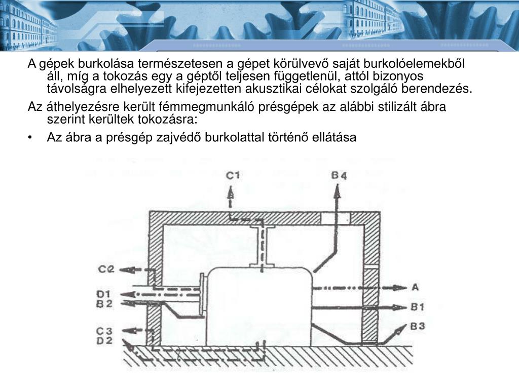 A gépek burkolása természetesen a gépet körülvevő saját burkolóelemekből áll, míg a tokozás egy a géptől teljesen függetlenül, attól bizonyos távolságra elhelyezett kifejezetten akusztikai célokat szolgáló berendezés. Az áthelyezésre került fémmegmunkáló présgépek az alábbi stilizált ábra szerint kerültek tokozásra: • Az ábra a présgép zajvédő burkolattal történő ellátása