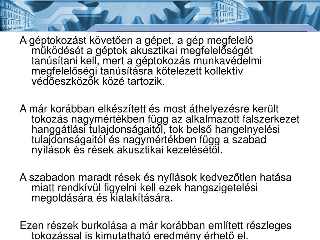 A géptokozást követően a gépet, a gép megfelelő működését a géptok akusztikai megfelelőségét tanúsítani kell, mert a géptokozás munkavédelmi megfelelőségi tanúsításra kötelezett kollektív védőeszközök közé tartozik. A már korábban elkészített és most áthelyezésre került tokozás nagymértékben függ az alkalmazott falszerkezet hanggátlási tulajdonságaitól, tok belső hangelnyelési tulajdonságaitól és nagymértékben függ a szabad nyílások és rések akusztikai kezelésétől. A szabadon maradt rések és nyílások kedvezőtlen hatása miatt rendkívül figyelni kell ezek hangszigetelési megoldására és kialakítására. Ezen részek burkolása a már korábban említett részleges tokozással is kimutatható eredmény érhető el.